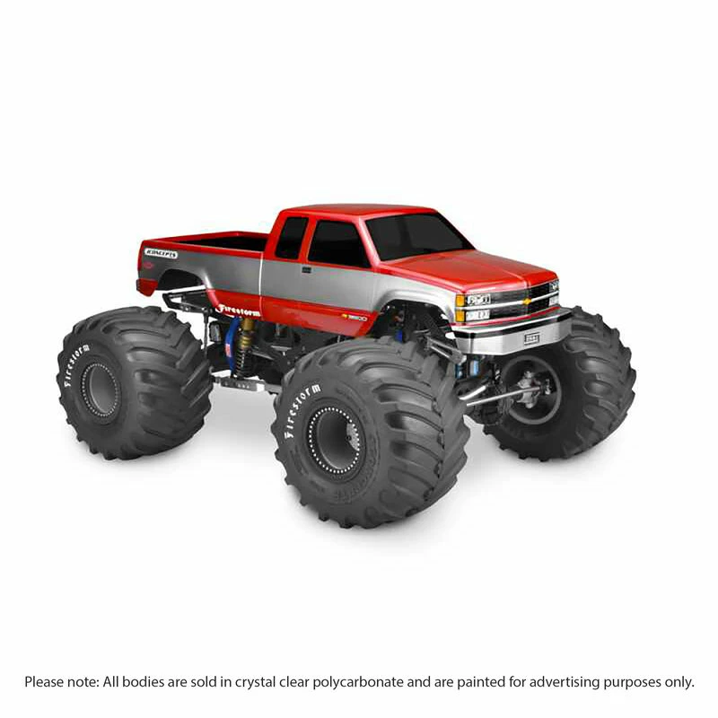 JConcepts is on top of the best monster truck body styles in the business with the release of the 1988 Chevy Silverado. The 1988 styling is very clean, updated, refined and didn’t display the boxy looks from the early 80’s. The fleetside, extended cab design is spot-on featuring slight curvature to the main shape, new headlights, grille treatment and form-fitting wheel wells. The slight flare to the tire openings give just a little wrinkle to the bed-sides and front fenders to accommodate different sized tires for maximum versatility.