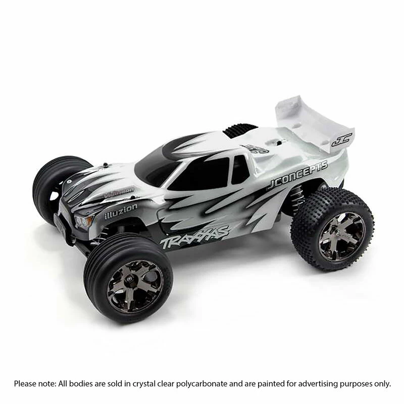 The “Hi-Speed” style is the latest in design for the Traxxas Rustler VXL truck by JConcepts. The Illuzion “Hi-Speed” styling presents a flowing design while incorporating many radical outlets and coves for additional air flow for electrical cooling. The Illuzion – “Hi-Speed” body is also the first to include a separate rear wing with side dams that attaches to the rear of the truck bed for superior fit and finish. Race inspired aggressive styling, Illuzionized cab and cove hood scoop combined with a durable flowing bed design are just some of the features that make the new Illuzion “Hi-Speed” body stand out from the rest.