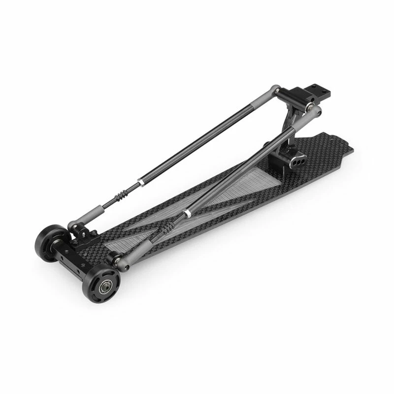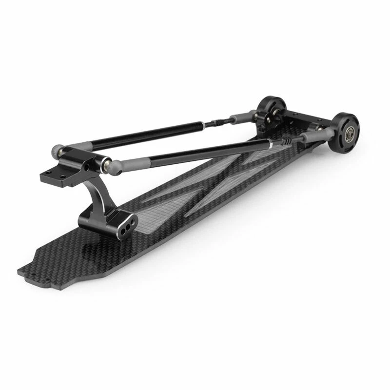 The design continues with a left and right support for the adjustable post which also connect via steel ball-ends and Team Associated ball-cups. Behind the posts, the adjustable wheel mount is bolted to a genuine carbon fiber plate which lines the bottom of the entire wheel bar and mounts under the chassis of the DR10. The wheel mount is aluminum and can be rotated for a different height setting for the wheels. The wheels themselves are precision delrin material which have been bored out for heavy-duty sized and included bearings. The wheels with bearings assemble toward the mount with sleeve and 3mm hardware.