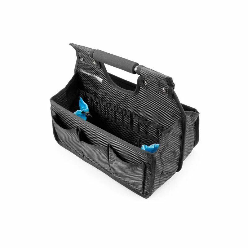 A racer can never have enough organization in the pit area and JConcepts has additional needs covered with the Finish Line pit bag. The highly accessible and multi-purpose pit bag has needs and wants covered with a multitude of compartments, closures, and foam wrapped metal handle. The bag features two locations where a drawstring compartment can store a typical fuel bottle and cinch into position. Each bag has a heavy covering of woven technical appearing fabric sewn over to create the glamourous geometry.
