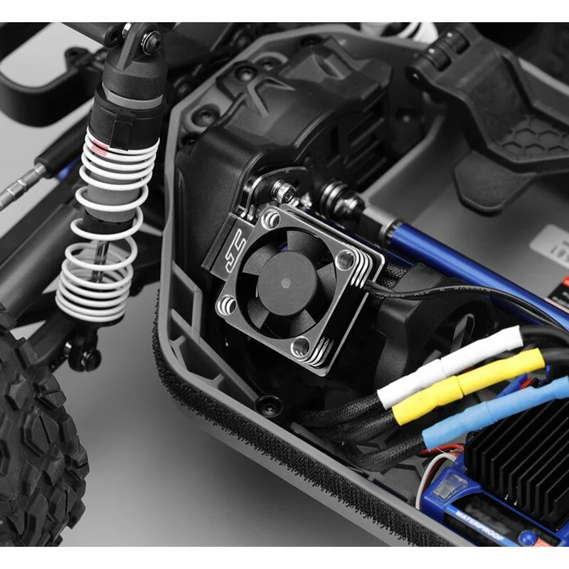 The high glamour motor and fan mount, machined in 6061 aluminum assists in the dissipation of heat from the motor and is a steady force to hold-up to bashing and driving punishment. The fan is added security to users running for longer periods of time who require cooler running temperatures through the motor. As always, cleanliness, care, and maintenance go a long way with mechanical and electrical devices. Keep items free of debris, wetness, and inspect wiring during each day of driving to ensure the fan is running and in working order.