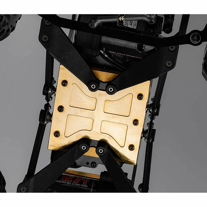JConcepts extends the tuning capability of the Regulator chassis conversion by offering a stackable chassis weight. The machined brass unit can be easily added to the bottom of the chassis to increase weight to one of the lowest locations on the vehicle. The design allows the ability to stack additional weights if necessary to the same footprint with (not included) hardware. Weight added to the chassis area on a retro monster truck can improve suspension performance by increasing the sprung weight. This allows for better jump handling and landing and the ability to plant the tires into the racing surface via front to rear weight transfer.