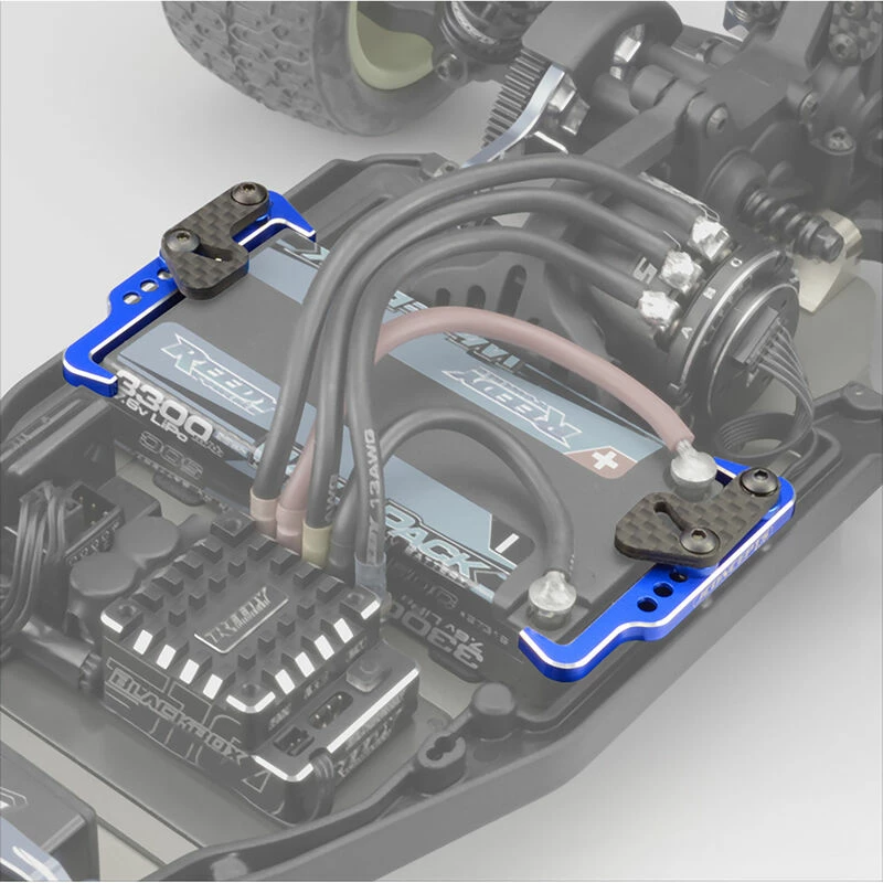 The JConcepts swing operated battery retainer is designed for simplicity, adjustability and quick battery changes. The aluminum rails bolt to the standard B6.3 | T6.2 | SC6.2 chassis side rails and with a selection of adjustment holes, can be moved to locate the battery pack fore and aft. The carbon fiber swings include pivoted control by the virtue of steel bushings. The entire assembly is secured using 3 x 16mm BHCS and the front screw provides the closure control and quick access for battery exchanges.