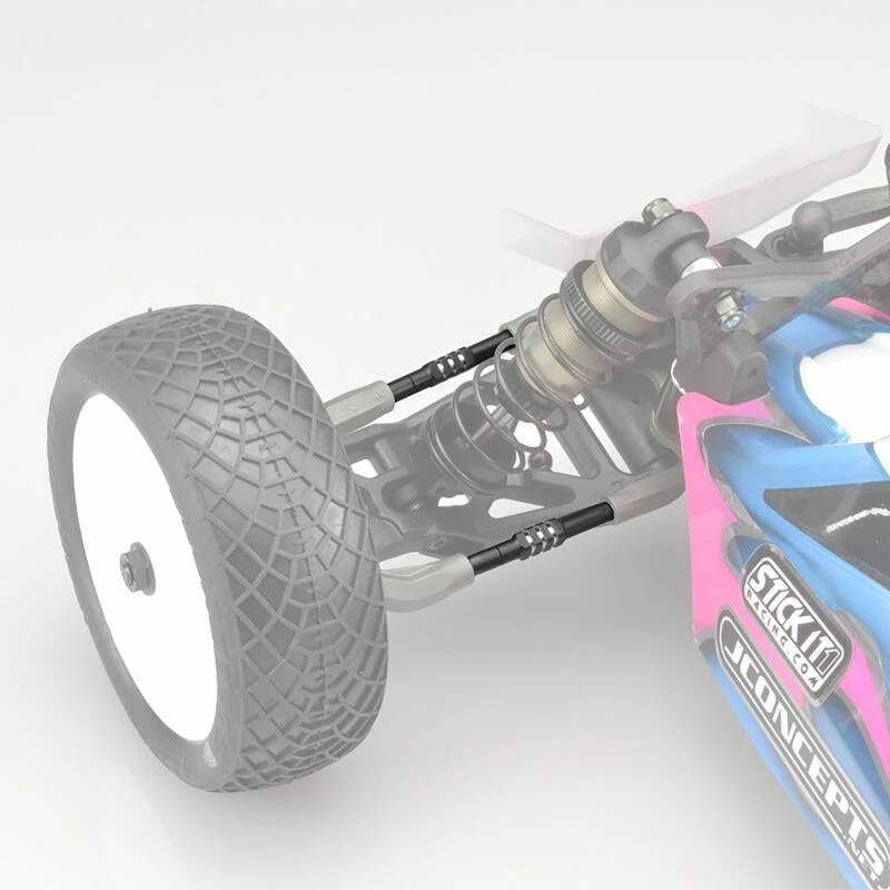 JConcepts is Titanium with the introduction of the Fin turnbuckle sets designed specifically for style, durability, and performance. The base of the design is centered around a 4mm titanium hex size which gradually tapers down into a 3.5mm thread base design which accepts the standard TLR ball-cup configuration. The focus of the styling surrounds the lengthened adjustment hex area and the “finned” cuts that rotate about the center.